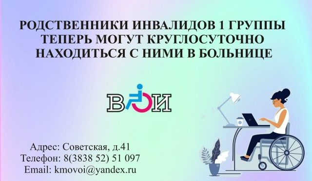 Родственники и законные представители инвалидов 1 группы получили возможность бесплатно находится в стационаре медицинского учреждения для осуществления бытового ухода, сообщает ВОИ Колыванского района.