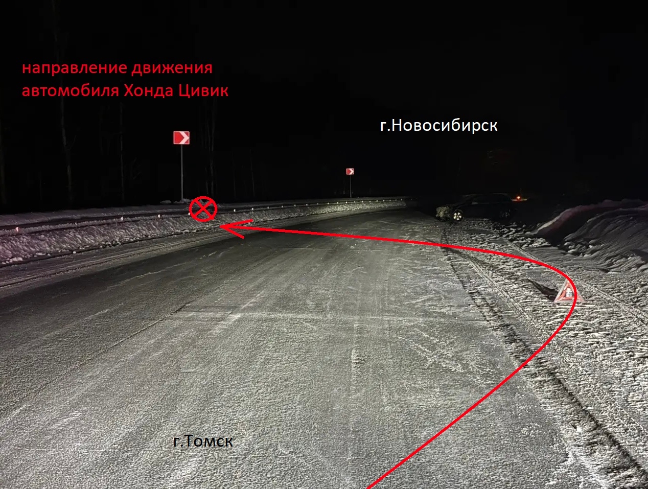 Наезд на препятствие: 03.03.2026 в 19 часов 10 минут водитель 1994 г.р., стаж вождения с 2014 года, управляя автомобилем Хонда Цивик, двигалась по а/д К-12 «Новосибирск-Колывань-Томск» со стороны р.п. Колывань в сторону г. Новосибирска и на 39 км. + 700 м. не справилась с управлением совершила съезд с дороги вправо по ходу движения, после чего совершила наезд на препятствие (бордюрное ограждение) слева по ходу движения ТС. В результате ДТП пострадала водитель Хонда Цивик , D/S: закрытый перелом грудной клетки.
